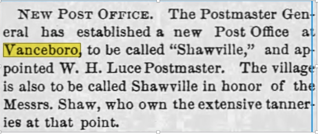 It wasn’t to be for long. On Nov 23, 1871, the Bangor Daily Whig and Courier reports a reversal of the decision. Shawville will be Vanceboro once again.