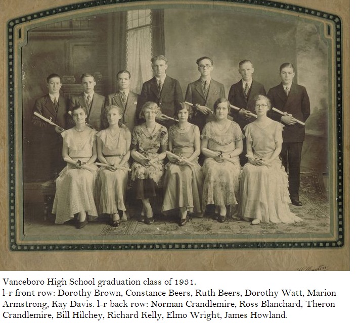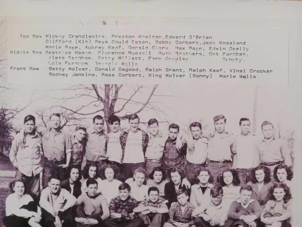 3rd row – Mr. Wescott, Vinal Crocker, Aub Keef, ????, Beatrice Nason, ????, Florence Russell, Max Raye, Mickey Crandlemire