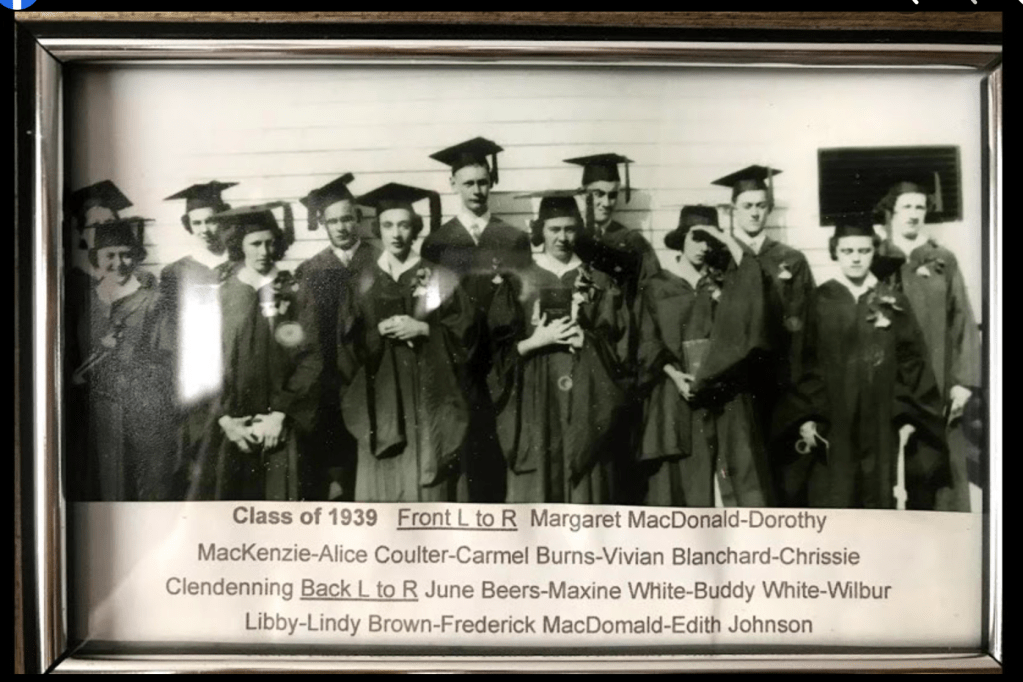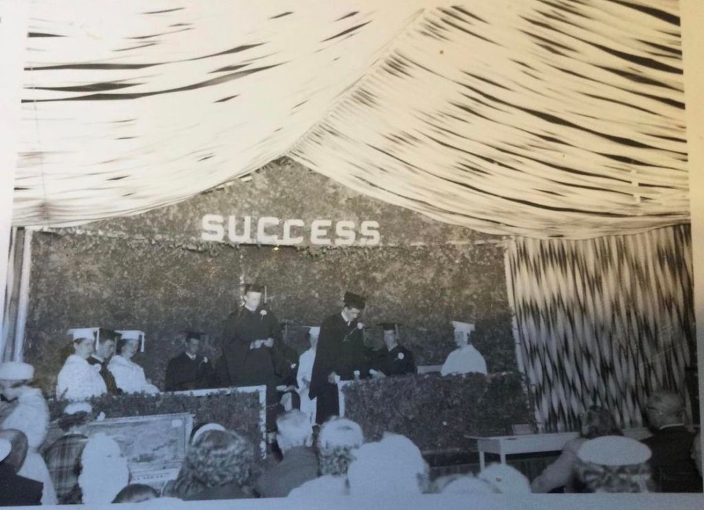 1960 graduation exercises, Knights of Pythias Hall. L to R: June Devoe, Douglas Grass, Norma Kelly, Vaughn Monk, John Gardner Gary Trafton (standing) and David Lounder. Behind Gary Trafton: John Howland, Bruce Grass, Eunice Wright, Raymond Lane, Clarice O’Brien.