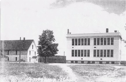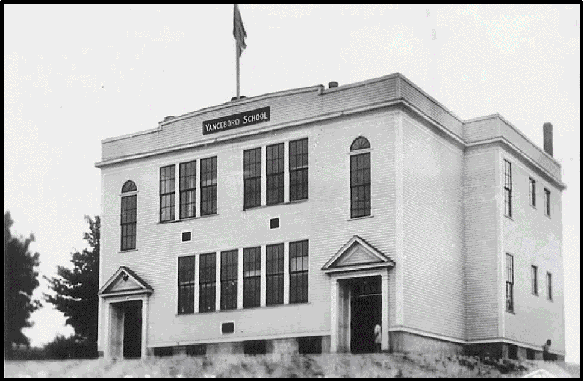 The back of the Vanceboro school. The Knights of Pythias Hall is to the left, across Third Street. The hall was used for community events as well as school dances and basketball games.