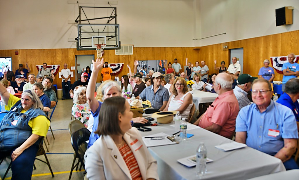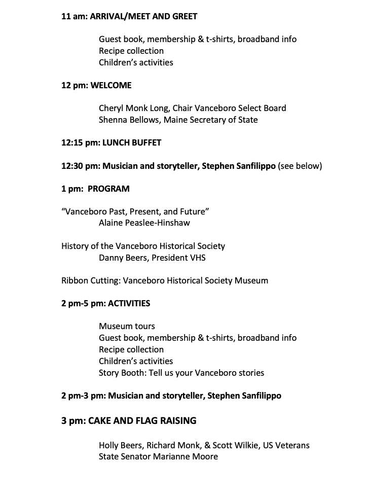 Vanceboro Community Center and Historical Museum welcome bannerA new sign, a great partnershipVanceboro selectwomen Cheryl Monk Long and Corinna Cropley welcome guestsSecretary of State Shenna Bellows presents Vanceboro’s incorporation papersVHS Secretary Alaine Peaslee-Hinshaw and President Dan Beers open the program Introducing the VHS BoardNearly 200 gatherHands up if you were raised in VanceboroA lunch of baked beans, mac & cheese, salads and rolls provided by the best cooks in townMuseum tourAppreciating the VHS museum displaysVanceboro Veterans raise a flag flown over the nation’s capitalVeterans from near and far, selectwomen, and dignitaries
