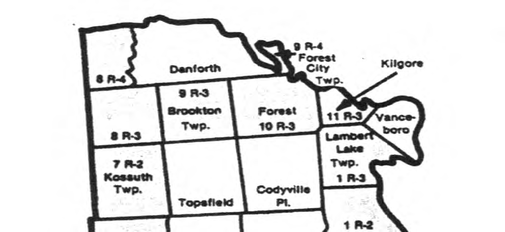 T11, R3 NBPP is small and bounded on the east by the St. Croix River. The Commission met at the home of Daniel Lambert on December 2, 1845, and set off three 100-acre lots and called the place Hill Gore, now spelled Kilgore [30 people].