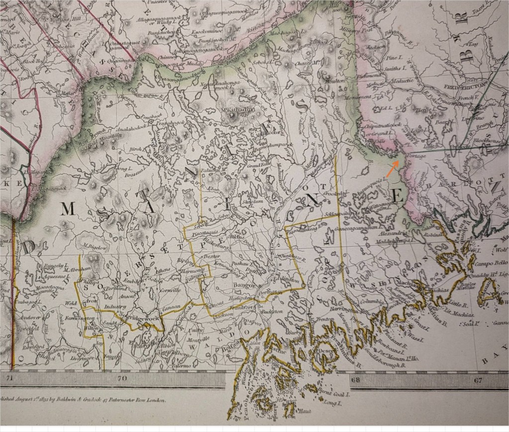 Note then-defined Northern border. Present border established in 1842 after the “Aroostook War”.